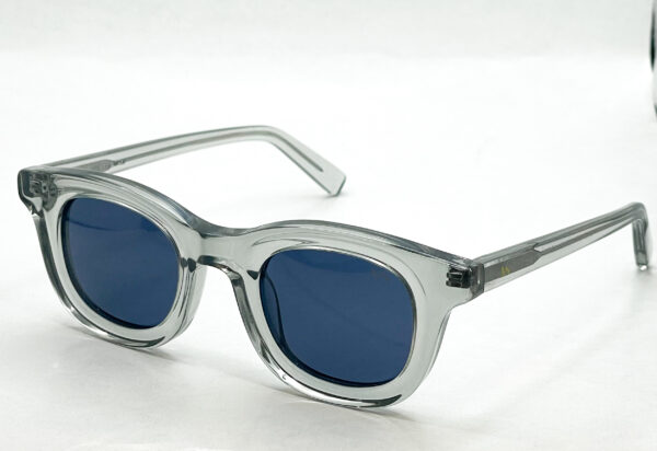 Monture disponible en Noir et en transparent avec des verres bleu unis.