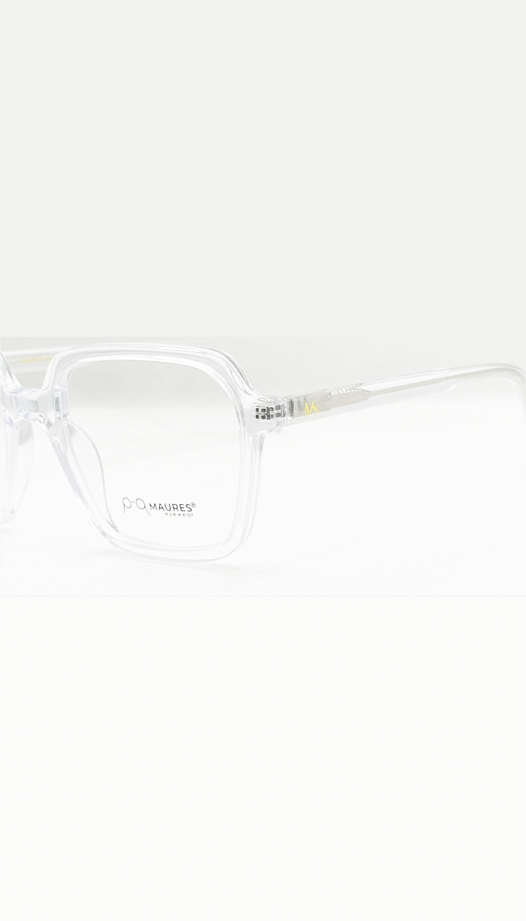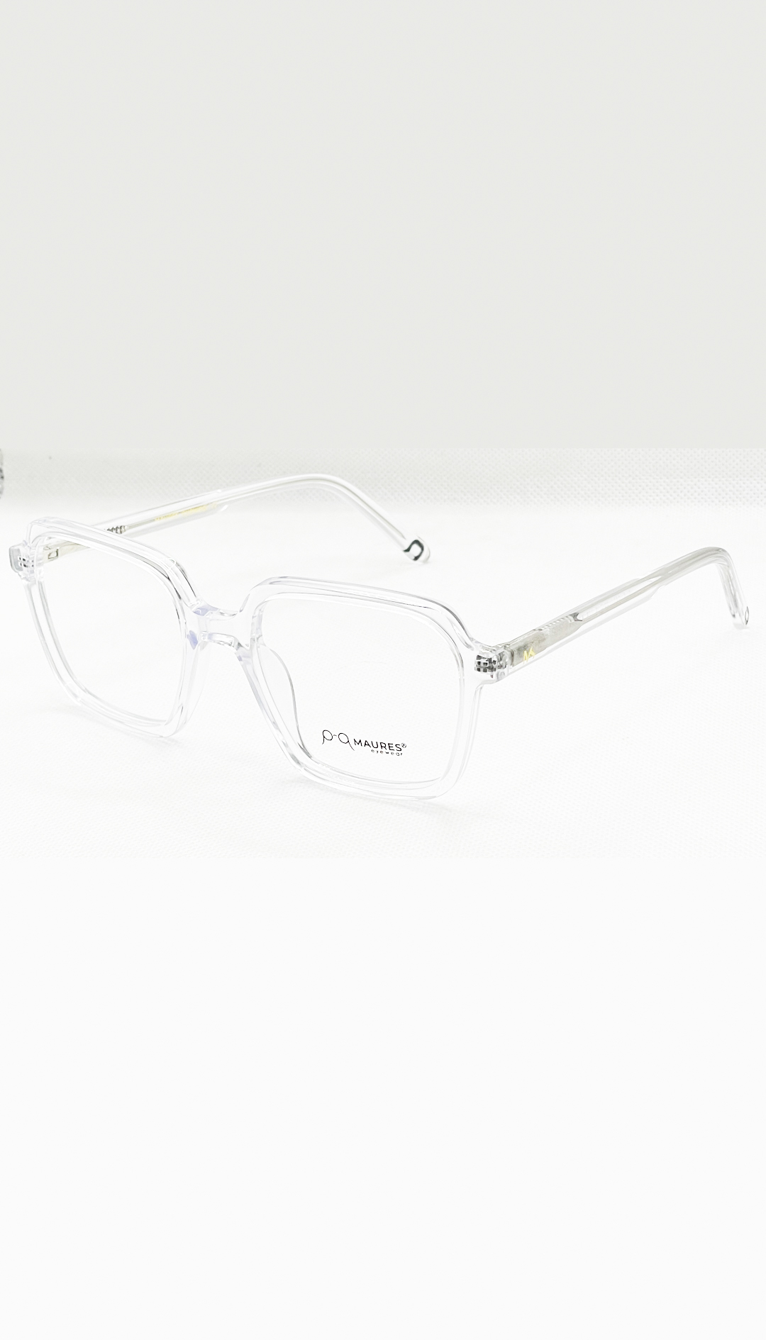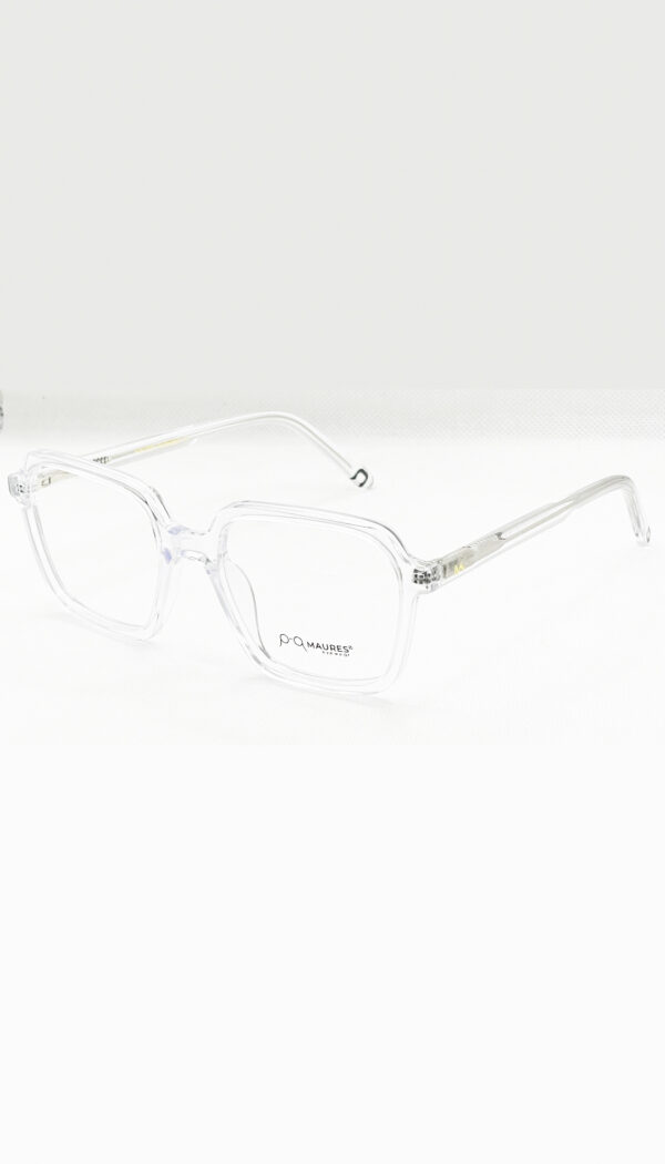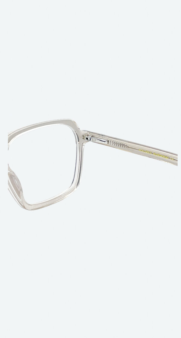 Monture en acétate disponible en blanc transparent, bleu transparent et nude transparent.