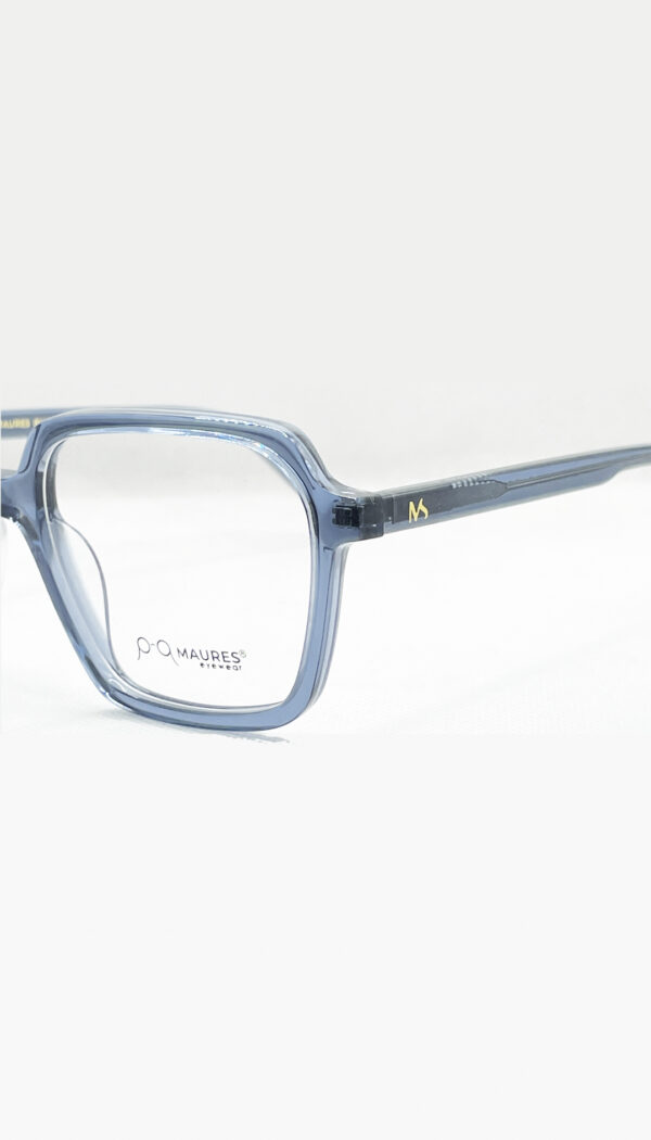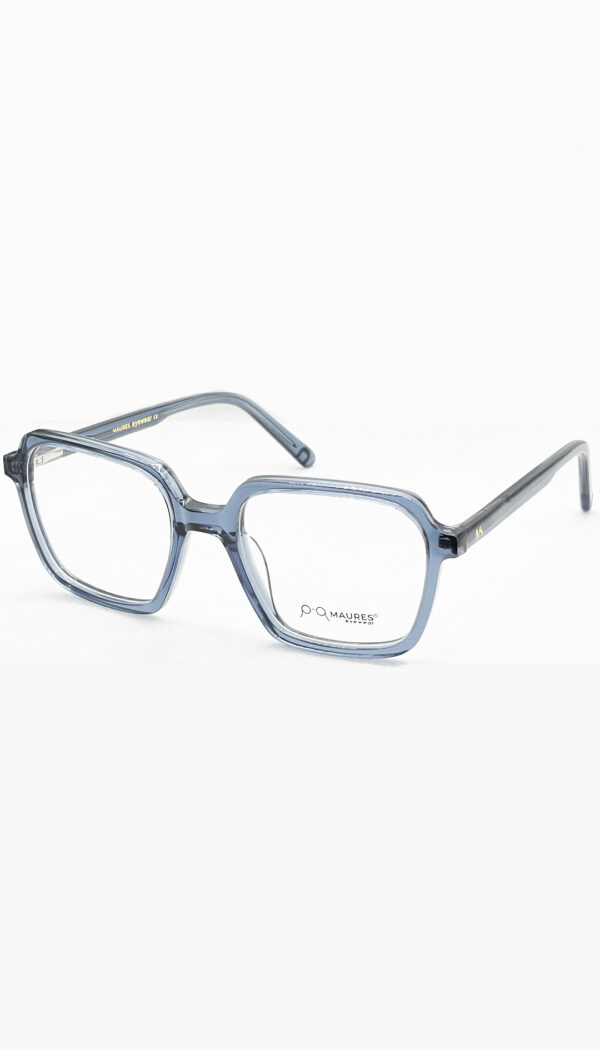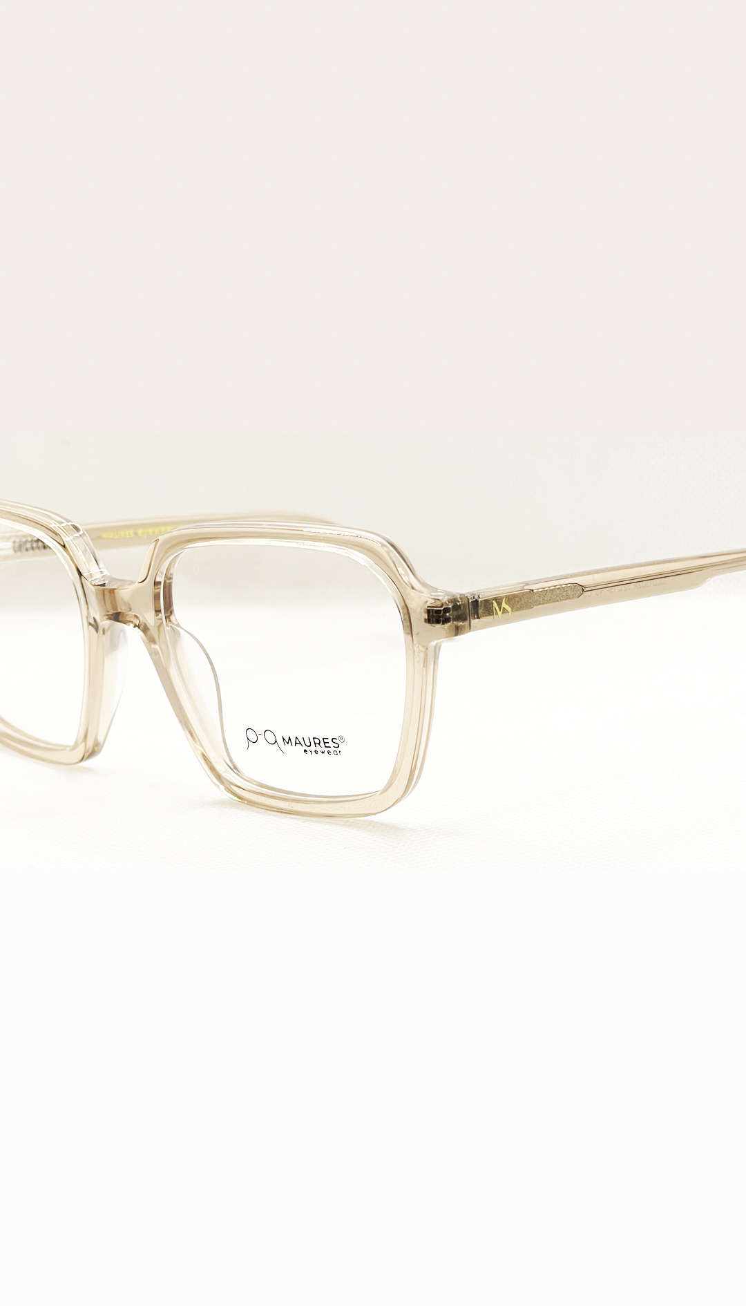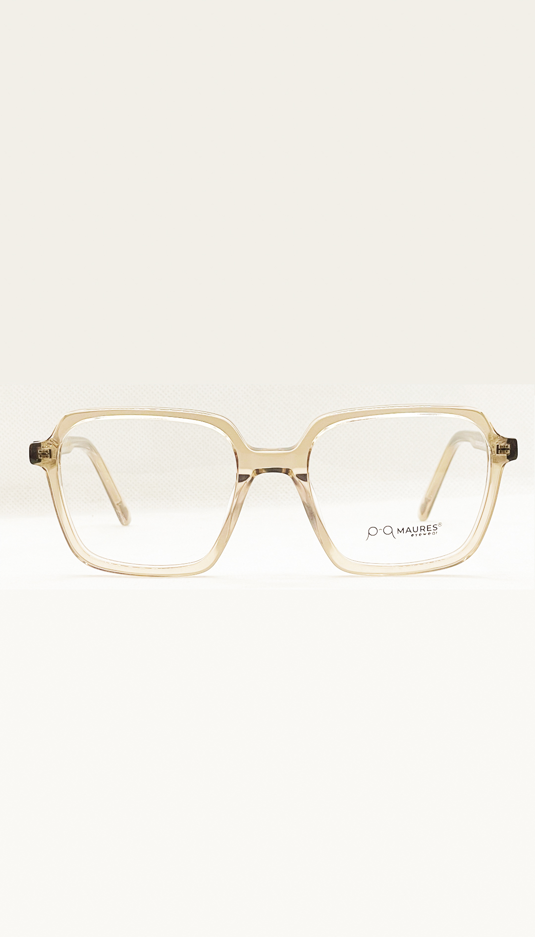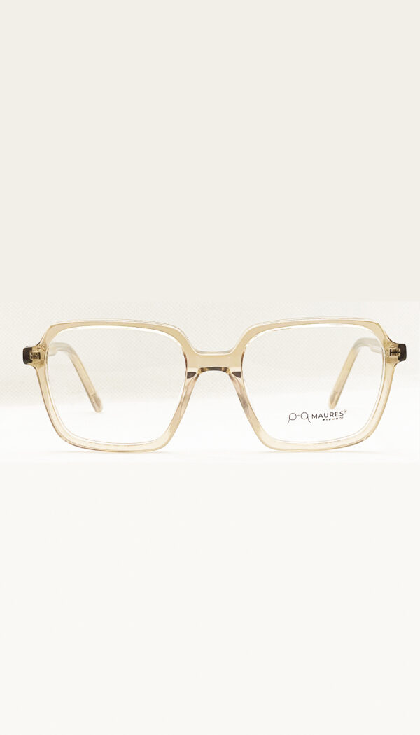 Monture en acétate disponible en blanc transparent, bleu transparent et nude transparent.