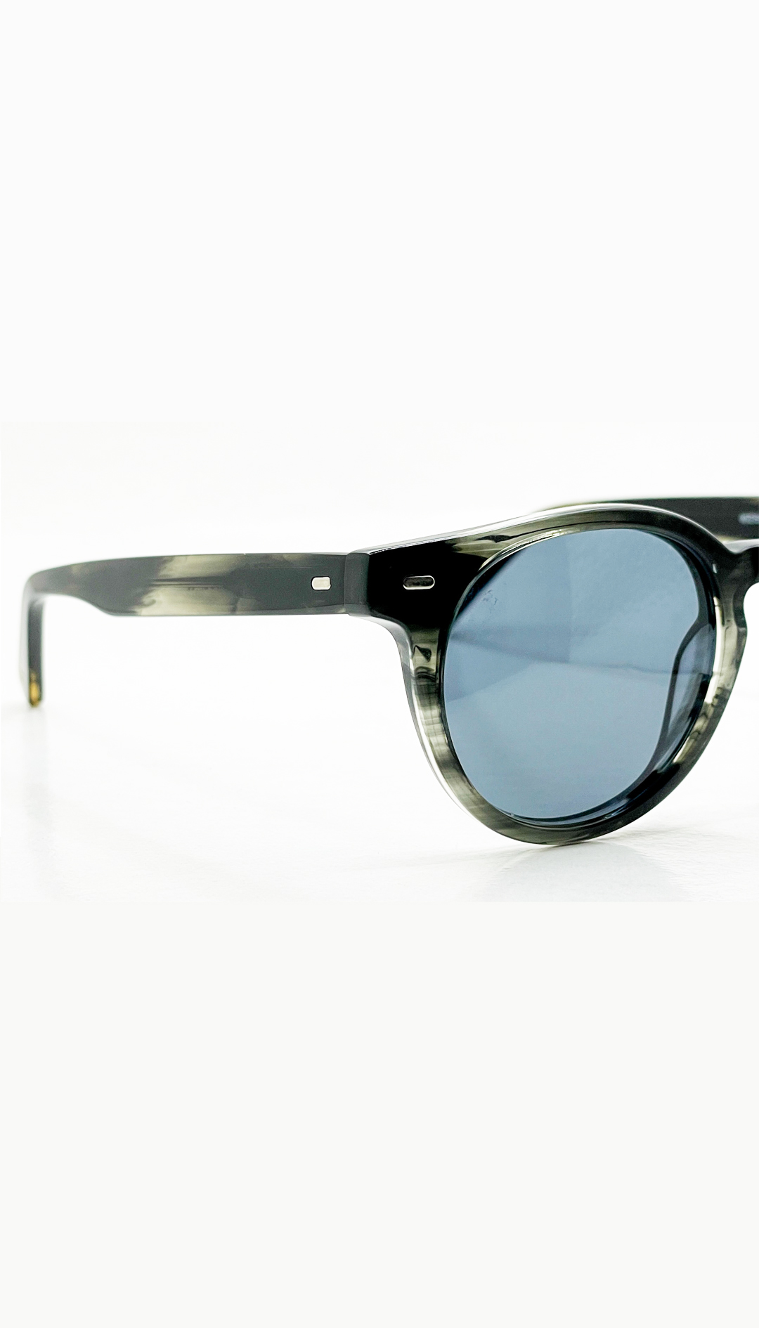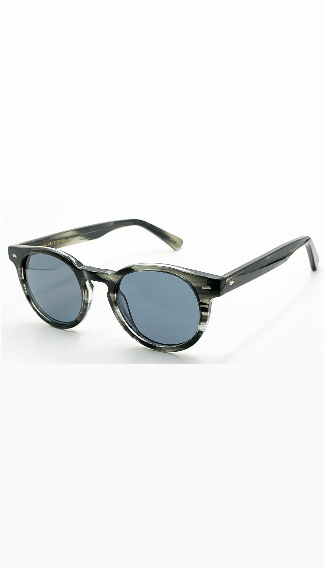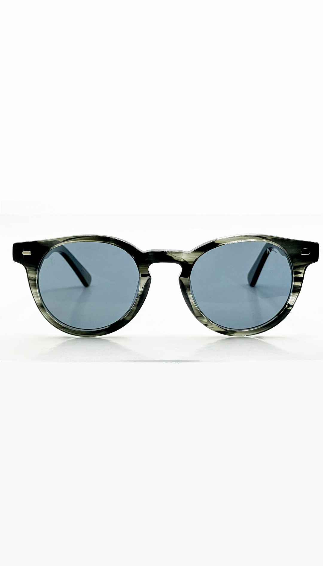 Monture disponible en vert et noir avec des verre de couleur gris bleu uni.