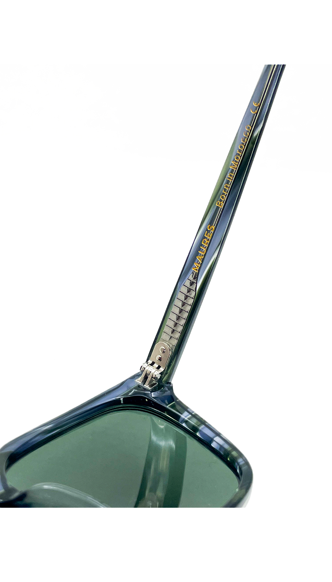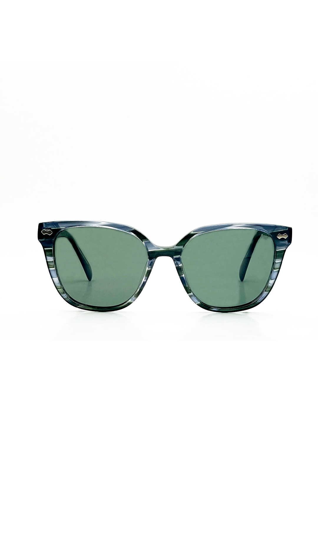 Monture disponible en bleu moucheté avec verre de couleur vert uni.