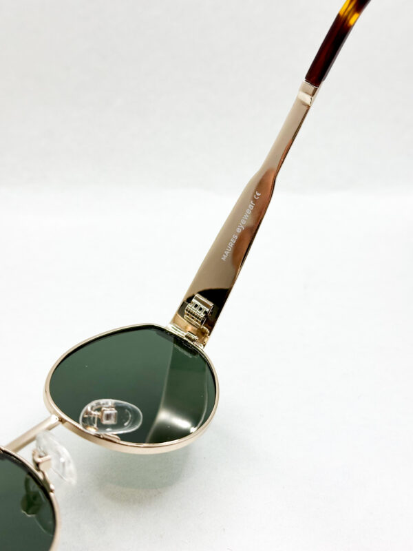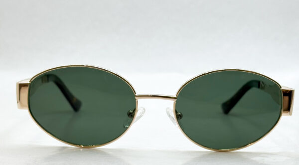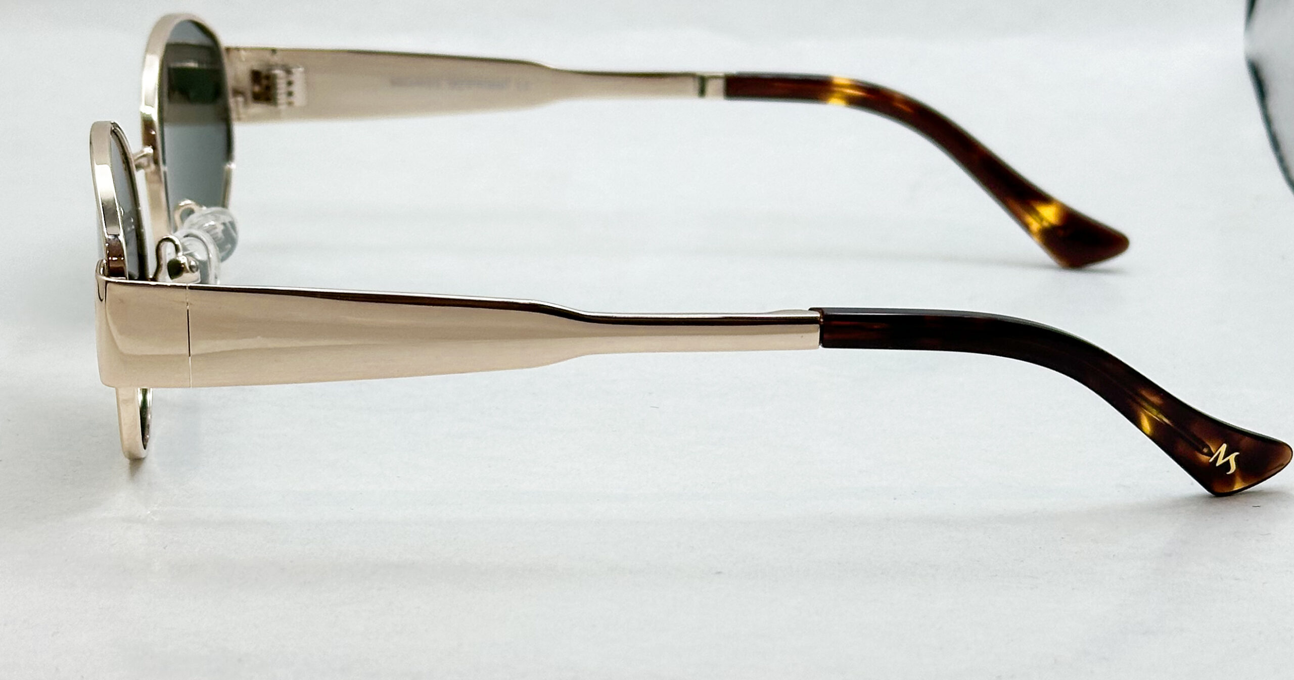 Monture disponible en Gold avec des verres verts ou rose unis.