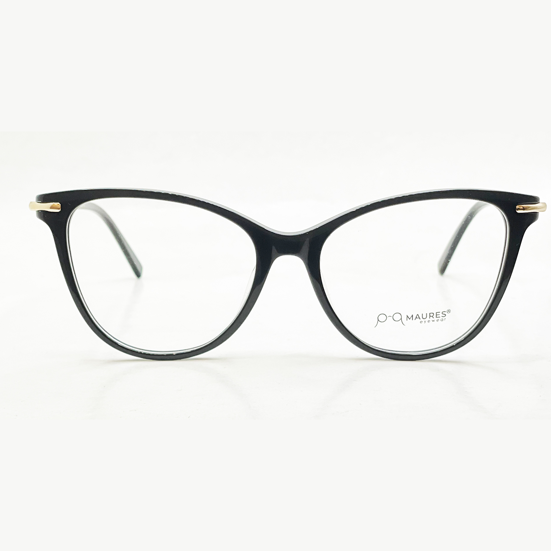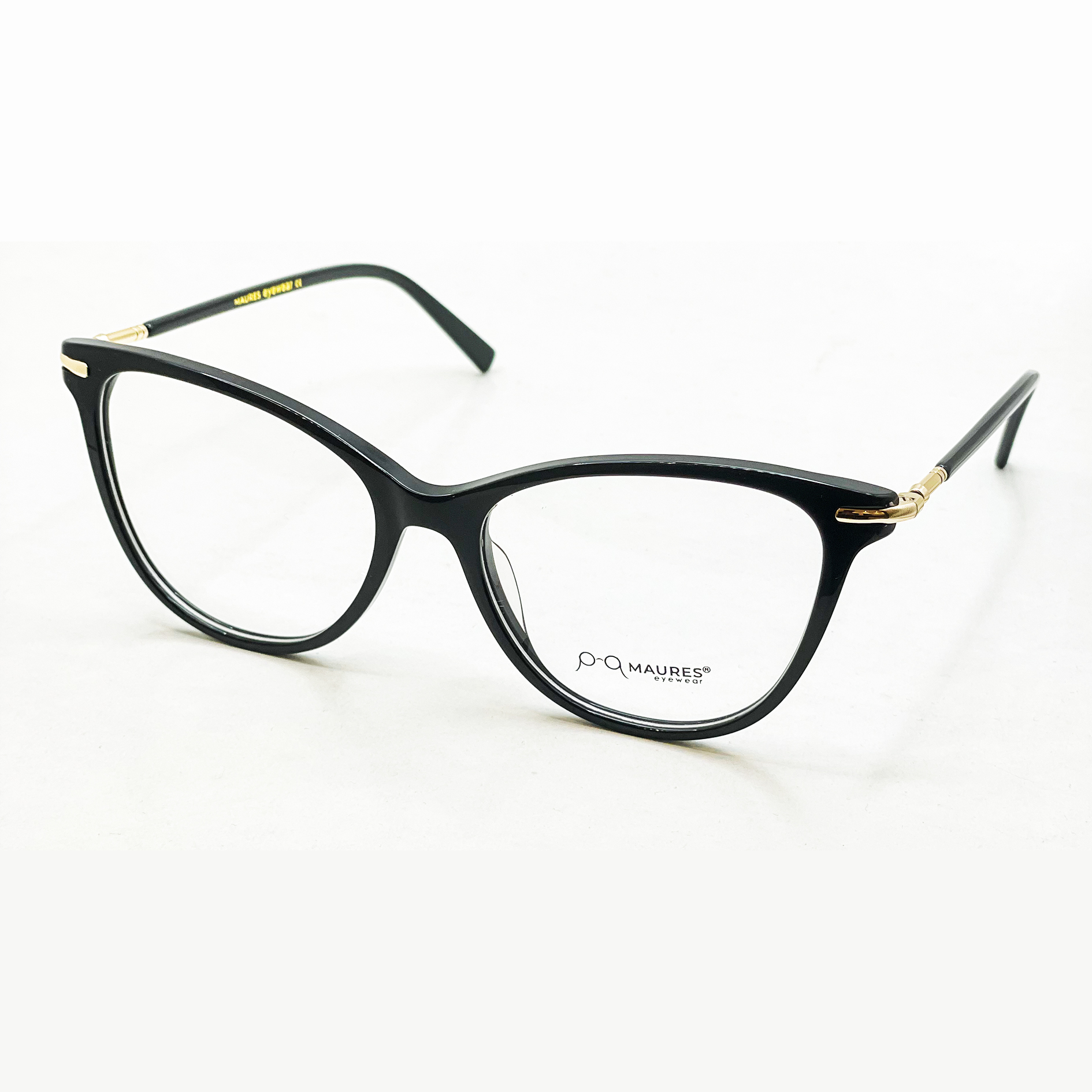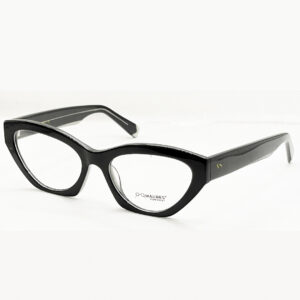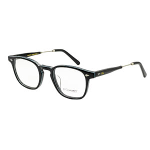 Monture en acétate disponible en noir avec des branche en plastique et métal doré.